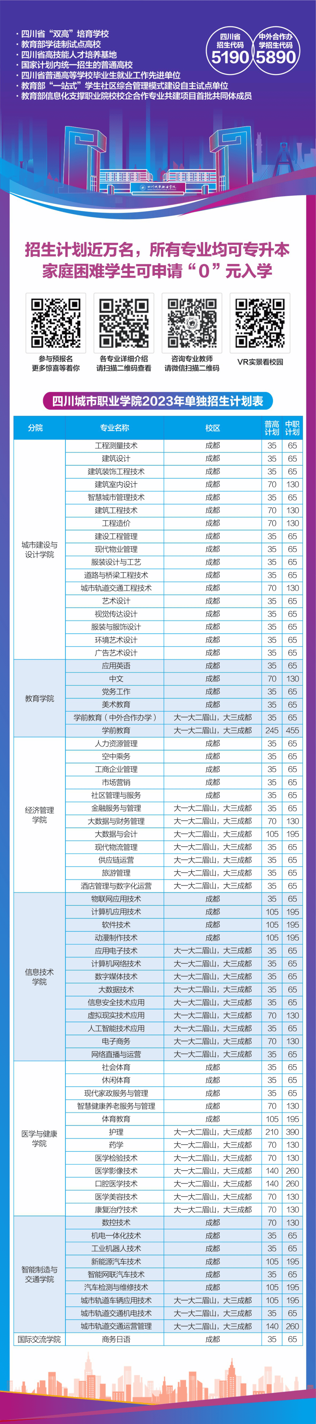 四川城市职业学院2023年单独招生简章专业校区计划数一览表: